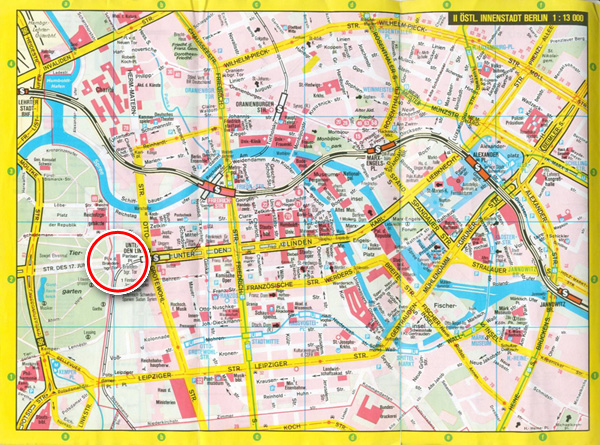 折りたたみ式のベルリンの地図(FALK社1991年版)の付録で、東の都心部。壁の跡は、aの列上から下まで赤いラインで引いてある。ブランデンブルグ門は、b2のブロック左寄り真ん中にある赤い■。ブランデンブルグ門の前にあった壁は、東西ベルリンを分かつ象徴的な場所であった。